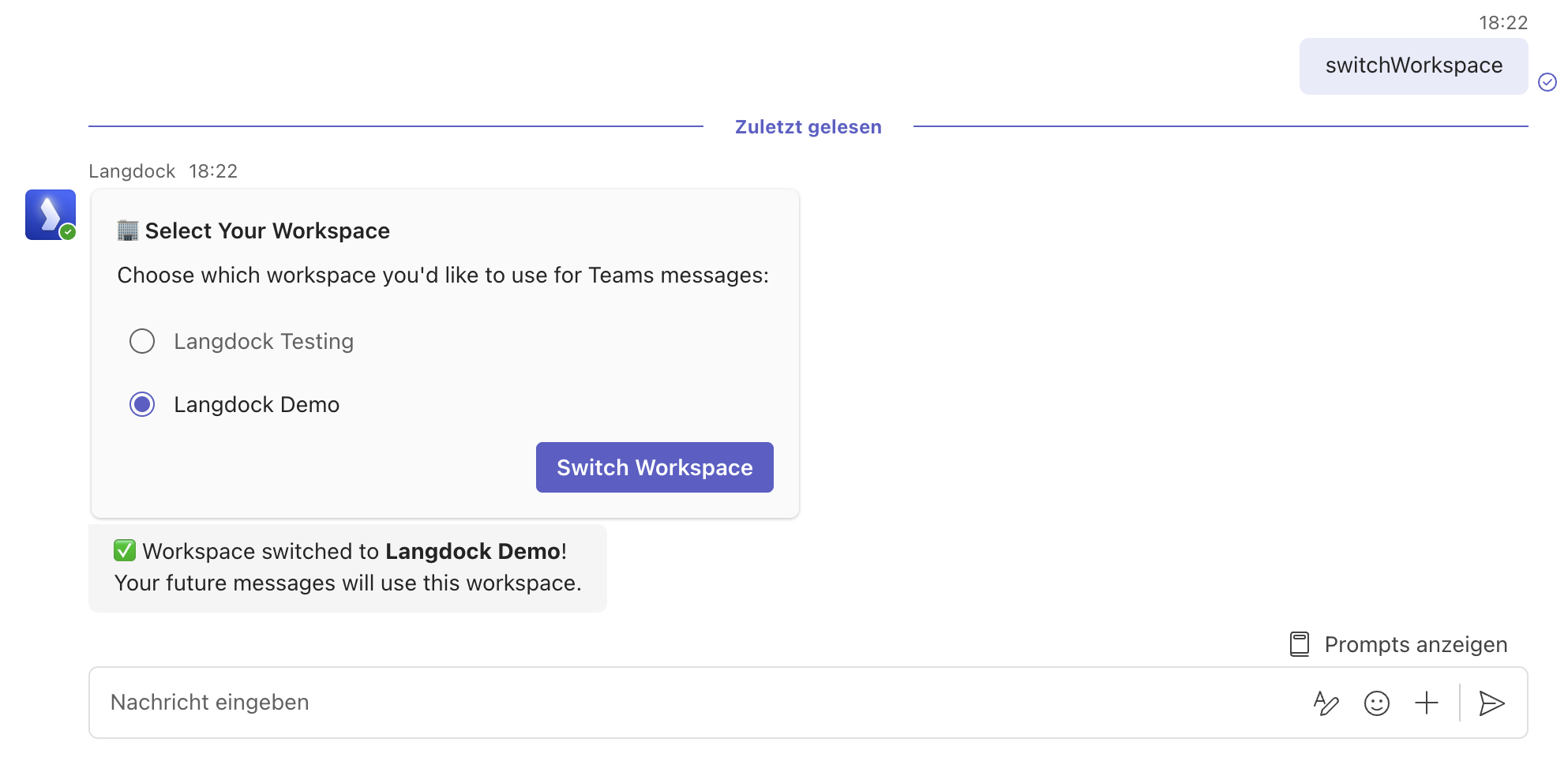 If you have access to multiple Langdock workspaces, use SwitchWorkspace to change which workspace you’re connected to. Select the workspace you want and click Switch Workspace.