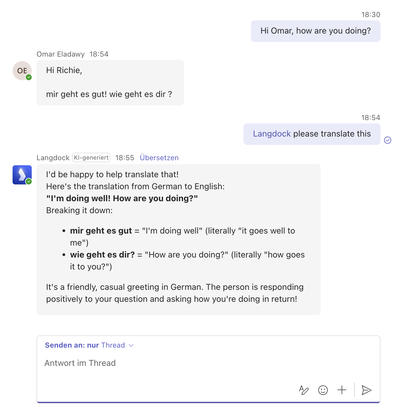 - For follow-up questions, tag @Langdock again to ensure your message gets routed to the bot