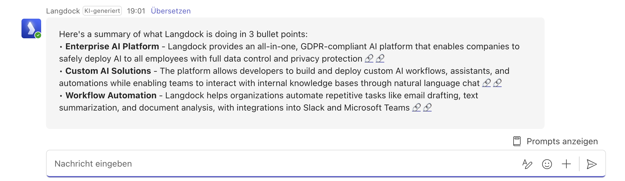 The Teams Bot has the same capabilities as the Langdock web app.- Web search for current information